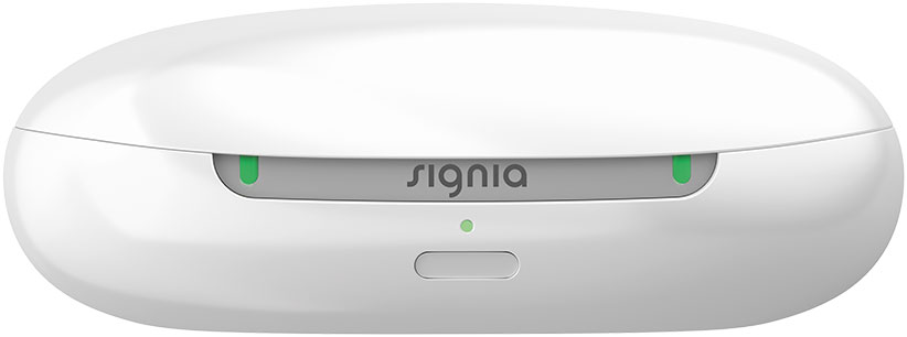 Über Nacht aufladen: Im stylischen, mobilen Lade-Etui. Genug Energie um Signia Active drei mal voll aufzuladen.